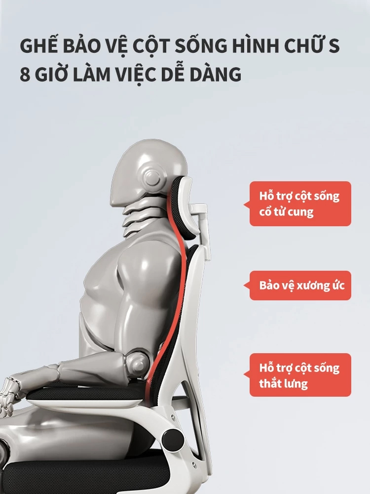 Ghế được thiết kế theo đường cong chữ S tự nhiên của cột sống người. Đây là yếu tố then chốt giúp giảm áp lực lên lưng và cổ.